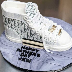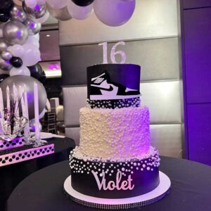 Custom Sneaker Cake in Black Buttercream with custom Acrylic sneakers and cake topper